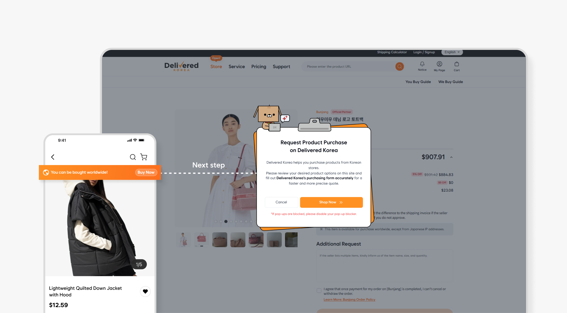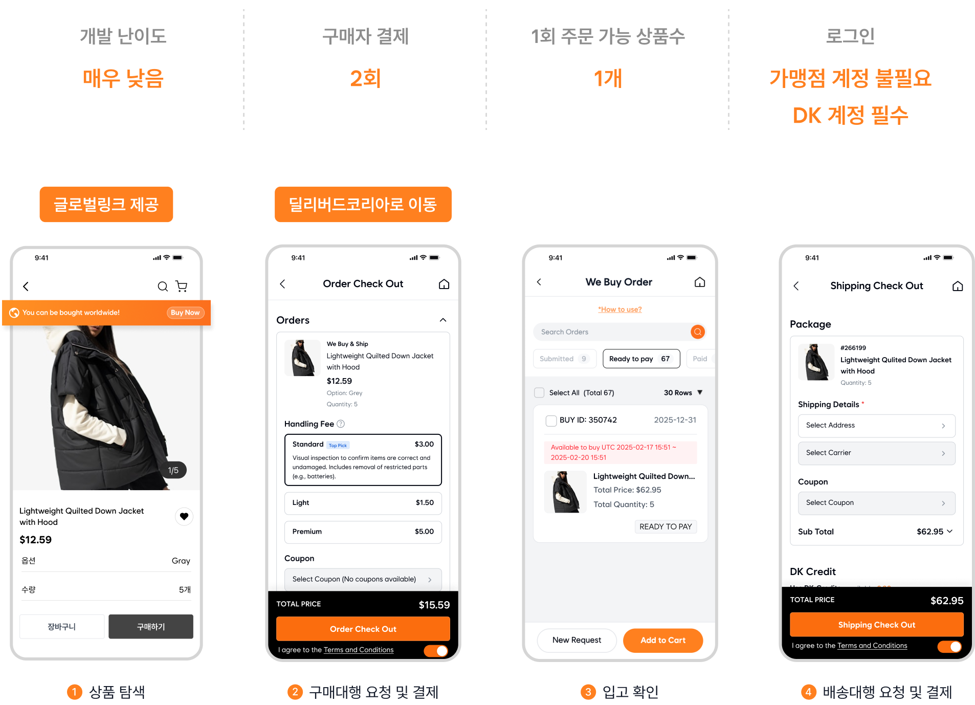 가맹점의 상품 페이지에 글로벌링크를 클릭하여 해외 고객들이 딜리버드 코리아를 통해 상품을 쉽게 구매할 수 있습니다. 해외 고객은 별도 가맹점 회원가입 또는 로그인을 해야하는 불편없이, 딜리버드 코리아 계정으로 주문과 결제를 진행할 수 있습니다.