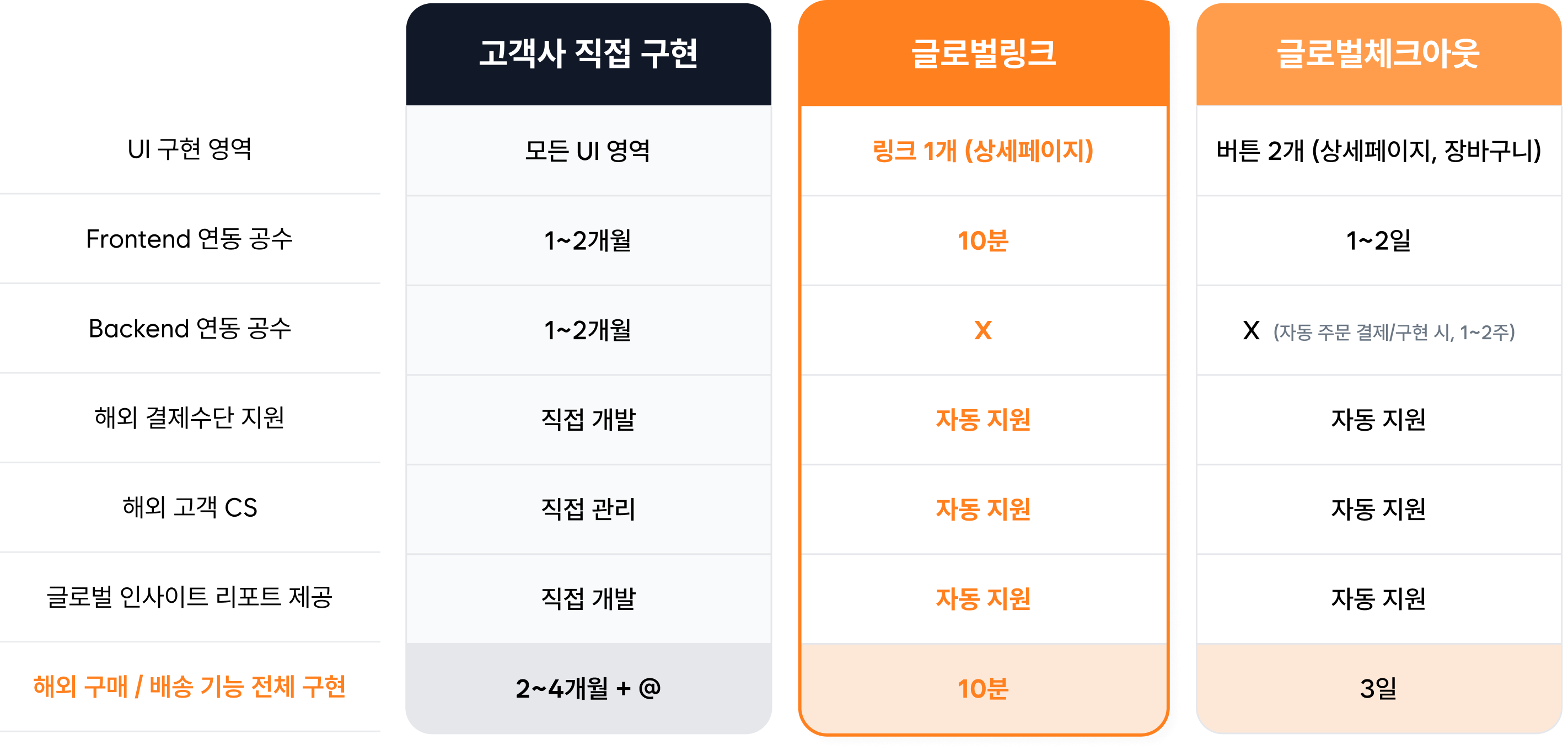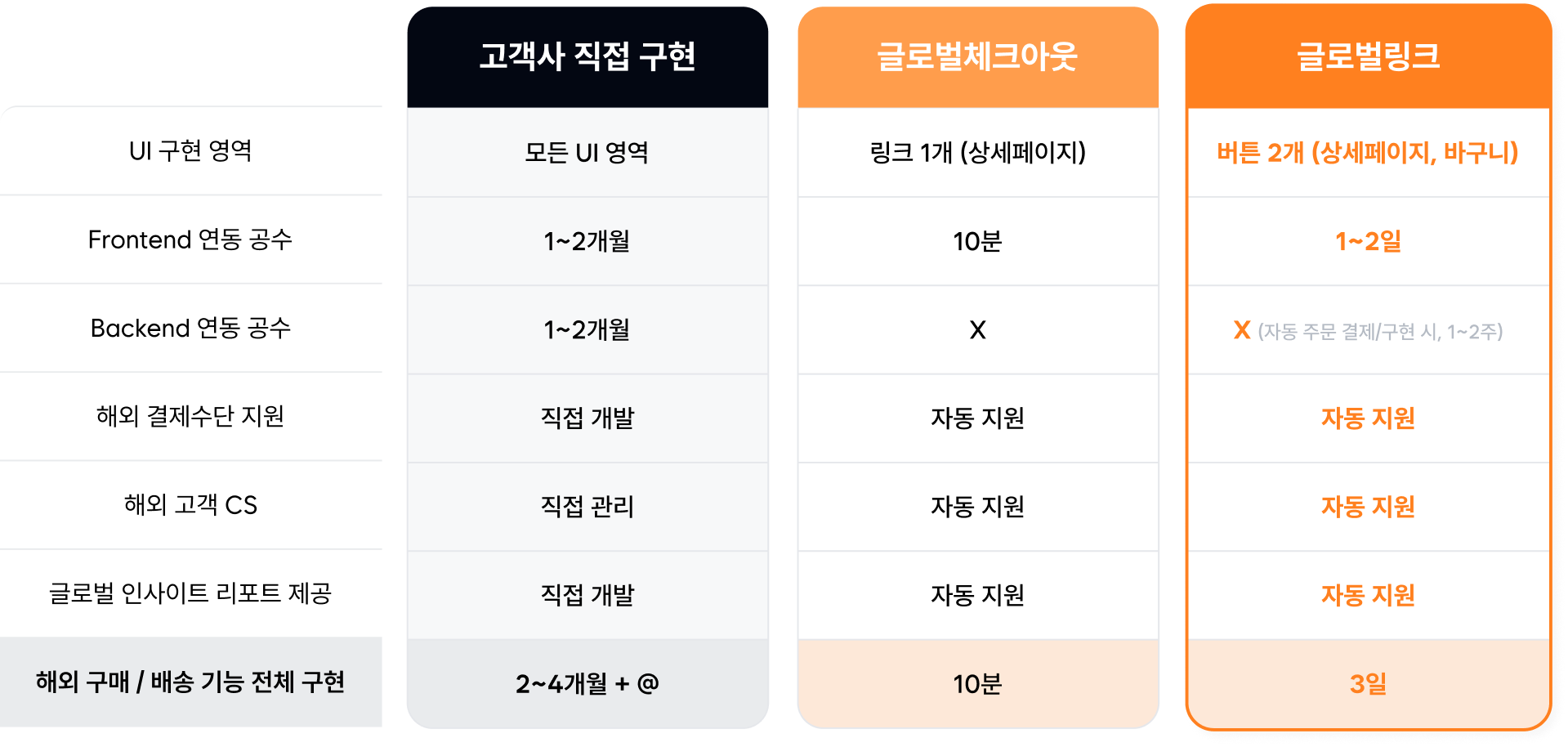 운영 중인 자사몰의 상품 상세 페이지에 글로벌링크를 설치하는 방식입니다. 간단한 방식으로 해외 주문, 해외 배송 기능을 빠르게 도입할 수 있습니다.
